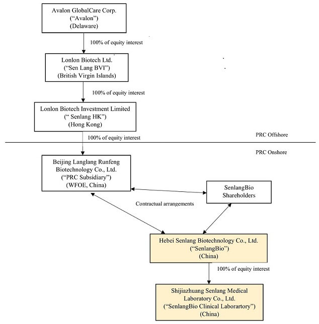 Both before and immediately after the Acquisition, Avalon was not and will not become a Chinese operating company, but will remain as a Delaware corporation. Sen Lang BVI, the company Avalon is seeking to acquire, is a BVI holding company with its operations conducted by its subsidiaries and through contractual arrangements with variable interest entities (“VIEs”) based in China. Sen Lang BVI, through the VIE structure (described in more detail in the section of the accompanying proxy statement titled “The Acquisition—The VIE Structure”) of contractual rights held by its wholly-owned subsidiary Beijing Langlang Runfeng Biotechnology Co., Ltd., a wholly foreign owned enterprise with limited liability organized and existing under the laws of the People’s Republic of China (the “PRC”) (the “PRC Subsidiary”), has full economic benefit and management control over, and is consolidated for accounting purposes with, Senlang Biotechnology Co. Ltd., a PRC domestic company with limited liability organized and existing under the laws of the PRC (the “OpCo” or “SenlangBio”), however, the PRC Subsidiary is a holding company and is not a Chinese operating company. SenlangBio operates its business in China and is mainly engaged in the business of research and development in relation to CAR-T cell therapy, immune cell therapy and related drug development. SenlangBio is owned 100% by certain of the Sen Lang BVI Beneficial Shareholders. A wholly-owned subsidiary of SenlangBio, Shijiazhuang Senlang Medical Laboratory Co., Ltd., a company with limited liability organized and existing under the laws of the PRC (“SenlangBio Clinical Laboratory”) operates its business in China and is engaged in the business of testing of immunology, serology and molecular genetics specialties for patients, including hematology-tumor diagnostics and testing prior to clinical trials for cell therapy. For a more detailed discussion of the business of SenlangBio and SenlangBio Clinical Laboratory, please see the section entitled “Information about SenlangBio.”