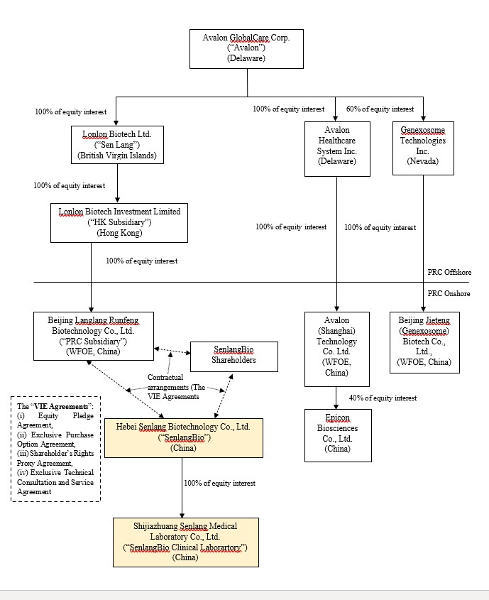 Both before and immediately after the Acquisition, Avalon was not and will not become a Chinese operating company, but will remain as a Delaware corporation. While Avalon is not a PRC operating company, certain of its subsidiaries are PRC operating companies and through them Avalon currently has substantial operations in the PRC. Sen Lang BVI, the company Avalon is seeking to acquire, is a BVI holding company with its operations conducted by its subsidiaries and through contractual arrangements with variable interest entities (“VIEs”) based in China. Sen Lang BVI, through the VIE structure (described in more detail in the section of the accompanying proxy statement titled “The Acquisition—The VIE Structure”) of contractual rights held by its wholly-owned subsidiary Beijing Langlang Runfeng Biotechnology Co., Ltd., a wholly foreign owned enterprise with limited liability organized and existing under the laws of the People’s Republic of China (the “PRC”) (the “PRC Subsidiary”), is deemed to be the primary beneficiary of, and is consolidated for accounting purposes with, Senlang Biotechnology Co. Ltd., a PRC domestic company with limited liability organized and existing under the laws of the PRC (the “OpCo” or “SenlangBio”), however, the PRC Subsidiary is a holding company and is not a Chinese operating company. The consolidation is due to Sen Lang BVI’s having (i) the power to direct activities of SenlangBio that most significantly impact SenlangBio’s economic performance and (ii) the obligation to absorb losses of SenlangBio that could potentially be significant to SenlangBio, or the right to receive benefits from SenlangBio that could potentially be significant to SenlangBio, in accordance with Financial Accounting Standards Board (“FASB”) Accounting Standards Codification (“ASC”) 810-10, Consolidation. See “Summary of the Proxy Statement—The VIE Structure.” SenlangBio operates its business in China and is mainly engaged in the business of research and development in relation to CAR-T cell therapy, immune cell therapy and related drug development. SenlangBio is owned 100% by certain of the Sen Lang BVI Beneficial Shareholders. A wholly-owned subsidiary of SenlangBio, Shijiazhuang Senlang Medical Laboratory Co., Ltd., a company with limited liability organized and existing under the laws of the PRC (“SenlangBio Clinical Laboratory”) operates its business in China and is engaged in the business of testing of immunology, serology and molecular genetics specialties for patients, including hematology-tumor diagnostics and testing prior to clinical trials for cell therapy. For a more detailed discussion of the business of SenlangBio and SenlangBio Clinical Laboratory, please see the section entitled “Information about SenlangBio.”