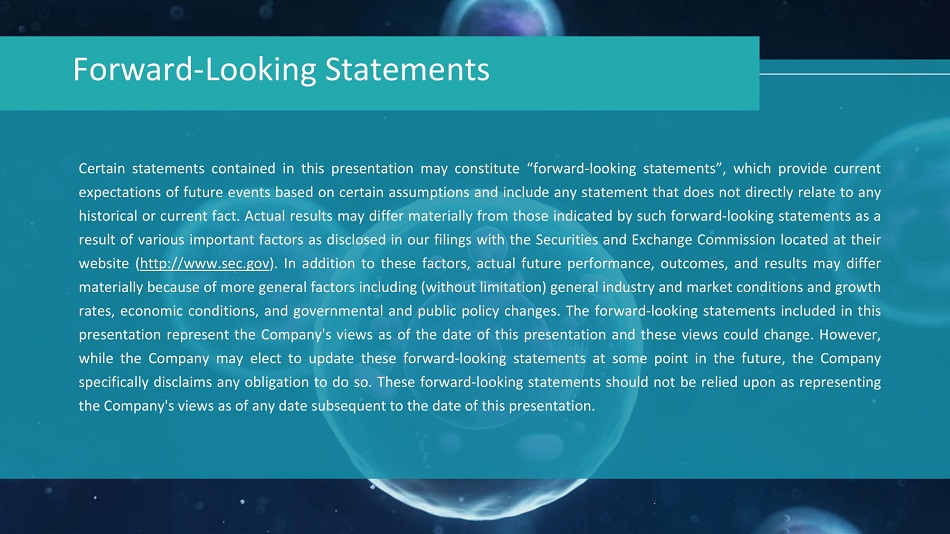 Certain statements contained in this presentation may constitute “forward - looking statements”, which provide current expectations of future events based on certain assumptions and include any statement that does not directly relate to any historical or current fact . Actual results may differ materially from those indicated by such forward - looking statements as a result of various important factors as disclosed in our filings with the Securities and Exchange Commission located at their website ( http : //www . sec . gov ) . In addition to these factors, actual future performance, outcomes, and results may differ materially because of more general factors including (without limitation) general industry and market conditions and growth rates, economic conditions, and governmental and public policy changes . The forward - looking statements included in this presentation represent the Company's views as of the date of this presentation and these views could change . However, while the Company may elect to update these forward - looking statements at some point in the future, the Company specifically disclaims any obligation to do so . These forward - looking statements should not be relied upon as representing the Company's views as of any date subsequent to the date of this presentation . Forward - Looking Statements