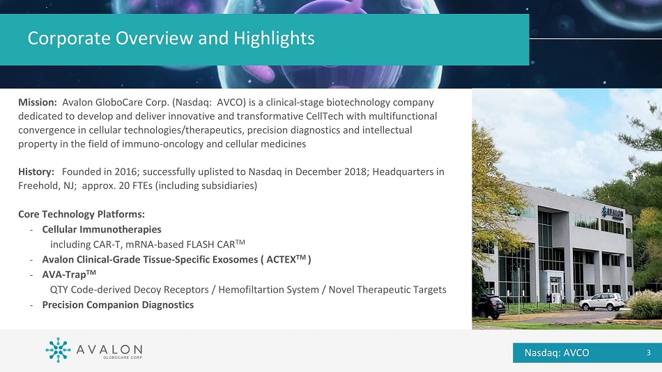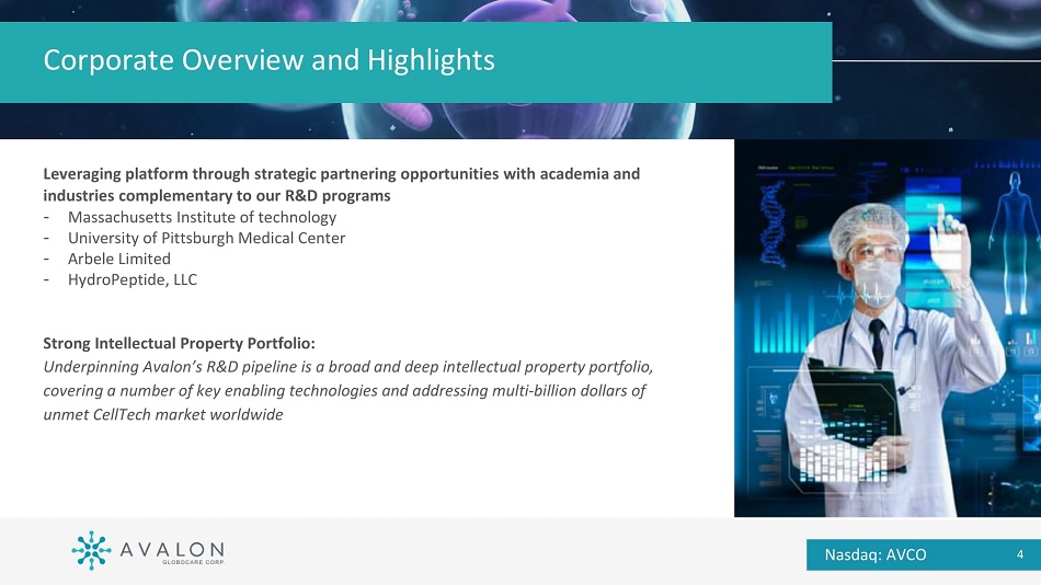 Mission: Avalon GloboCare Corp. (Nasdaq: AVCO) is a clinical - stage biotechnology company dedicated to develop and deliver innovative and transformative CellTech with multifunctional convergence in cellular technologies/therapeutics, precision diagnostics and intellectual property in the field of immuno - oncology and cellular medicines History: Founded in 2016; successfully uplisted to Nasdaq in December 2018; Headquarters in Freehold, NJ; approx. 20 FTEs (including subsidiaries) Core Technology Platforms: - Cellular Immunotherapies including CAR - T, mRNA - based FLASH CAR TM - Avalon Clinical - Grade Tissue - Specific Exosomes ( ACTEX TM ) - AVA - Trap TM QTY Code - derived Decoy Receptors / Hemofiltartion System / Novel Therapeutic Targets - Precision Companion Diagnostics Corporate Overview and Highlights Nasdaq: AVCO 3