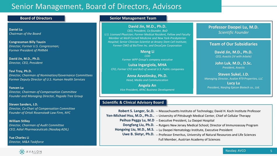 Corporate Overview and Highlights Leveraging platform through strategic partnering opportunities with academia and industries complementary to our R&D programs - Massachusetts Institute of technology - University of Pittsburgh Medical Center - Arbele Limited - HydroPeptide, LLC Strong Intellectual Property Portfolio: Underpinning Avalon’s R&D pipeline is a broad and deep intellectual property portfolio, covering a number of key enabling technologies and addressing multi - billion dollars of unmet CellTech market worldwide Nasdaq: AVCO 4