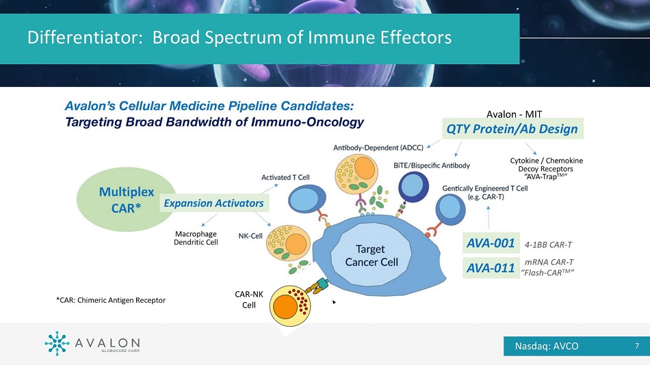 Differentiator: Broad Spectrum of Immune Effectors CAR - NK Cell Nasdaq: AVCO 7 Avalon - MIT