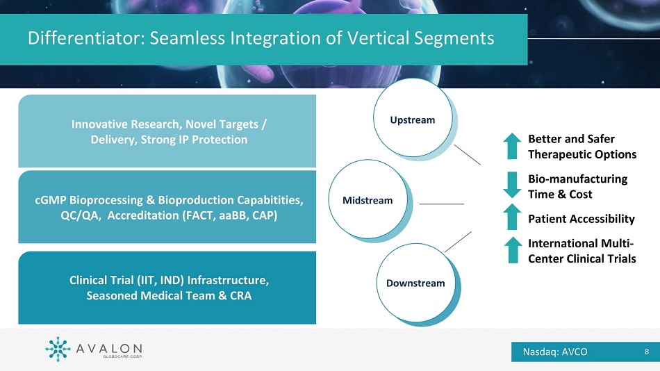 Differentiator: Seamless Integration of Vertical Segments Innovative Research, Novel Targets / Delivery, Strong IP Protection cGMP Bioprocessing & Bioproduction Capabitities, QC/QA, Accreditation (FACT, aaBB, CAP) Clinical Trial (IIT, IND) Infrastrructure, Seasoned Medical Team & CRA Upstream Midstream Downstream Better and Safer Therapeutic Options Bio - manufacturing Time & Cost Patient Accessibility International Multi - Center Clinical Trials Nasdaq: AVCO 8