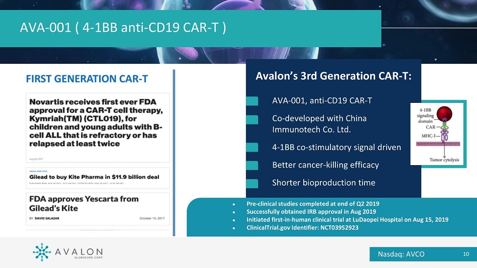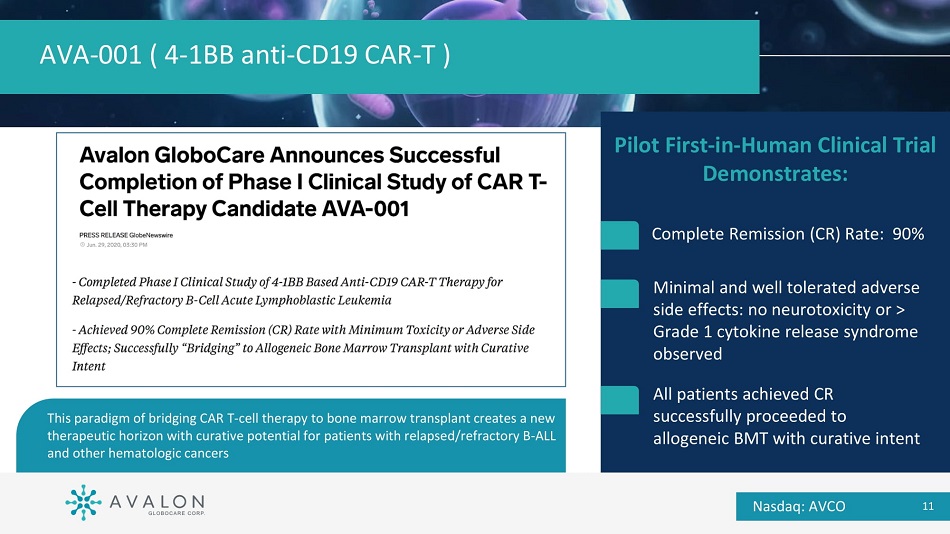 AVA - 001 ( 4 - 1BB anti - CD19 CAR - T ) Avalon’s 3rd Generation CAR - T: AVA - 001, anti - CD19 CAR - T Co - developed with China Immunotech Co. Ltd. 4 - 1BB co - stimulatory signal driven Better cancer - killing efficacy Shorter bioproduction time ● Pre - clinical studies completed at end of Q2 2019 ● Successfully obtained IRB approval in Aug 2019 ● Initiated first - in - human clinical trial at LuDaopei Hospital on Aug 15, 2019 ● ClinicalTrial.gov Identifier: NCT03952923 Nasdaq: AVCO 10