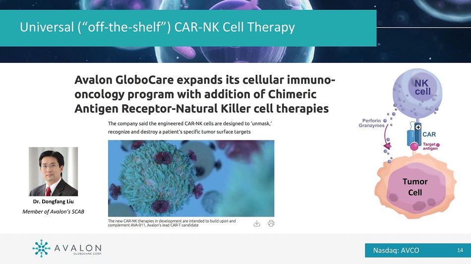Universal (“off - the - shelf”) CAR - NK Cell Therapy Tumor Cell Dr. Dongfang Liu Member of Avalon’s SCAB Nasdaq: AVCO 14