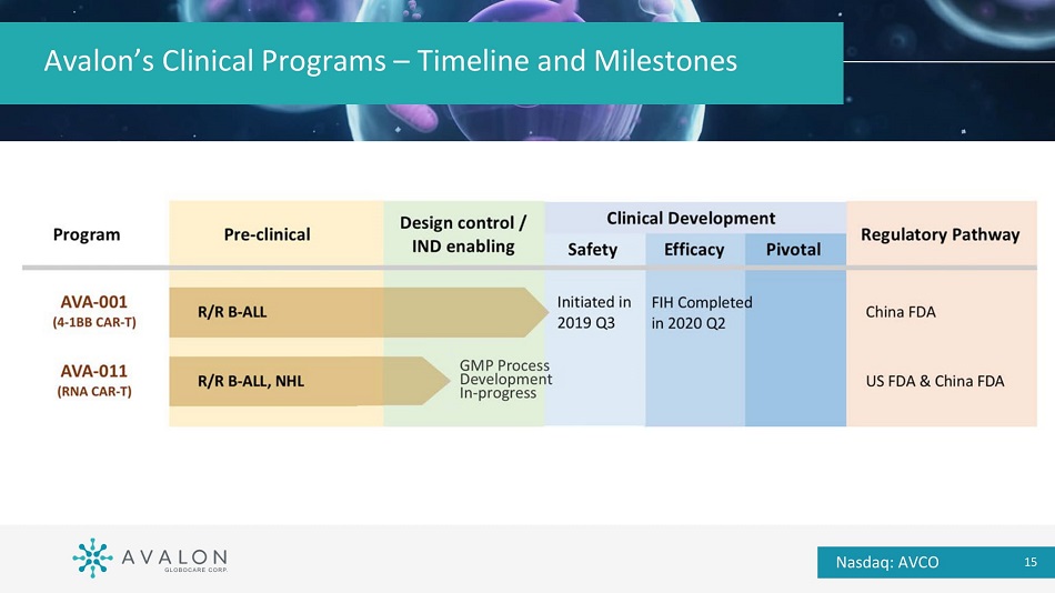 Avalon’s Clinical Programs – Timeline and Milestones Nasdaq: AVCO 15
