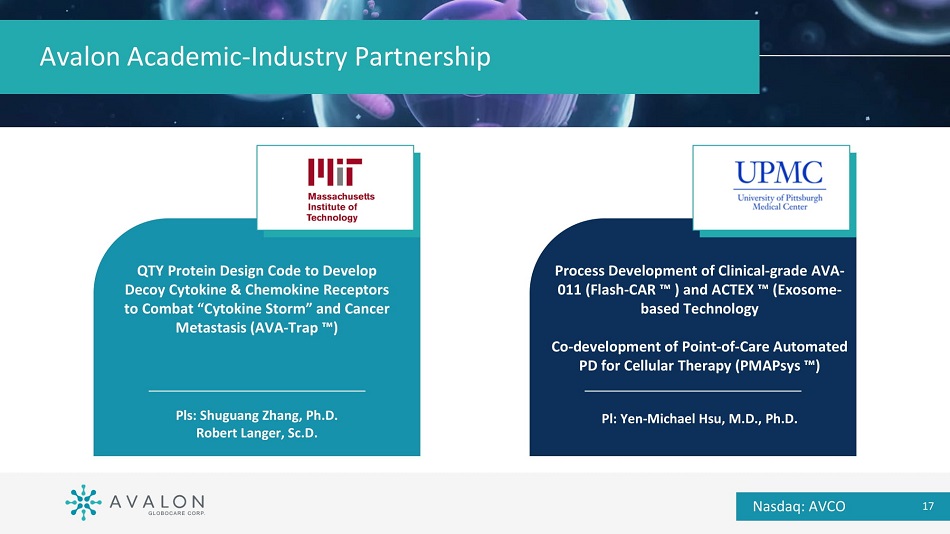 Avalon Academic - Industry Partnership QTY Protein Design Code to Develop Decoy Cytokine & Chemokine Receptors to Combat “Cytokine Storm” and Cancer Metastasis (AVA - Trap Ρ ) Pls: Shuguang Zhang, Ph.D. Robert Langer, Sc.D. Process Development of Clinical - grade AVA - 011 (Flash - CAR Ρ ) and ACTEX Ρ (Exosome - based Technology Co - development of Point - of - Care Automated PD for Cellular Therapy (PMAPsys Ρ ) Pl: Yen - Michael Hsu, M.D., Ph.D. Nasdaq: AVCO 17