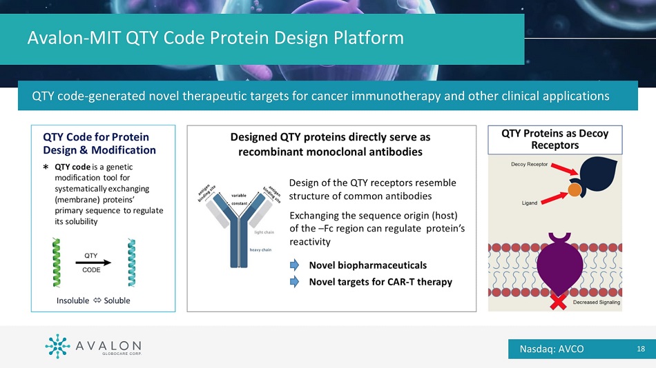 Avalon - MIT QTY Code Protein Design Platform QTY code - generated novel therapeutic targets for cancer immunotherapy and other clinical applications Nasdaq: AVCO 18