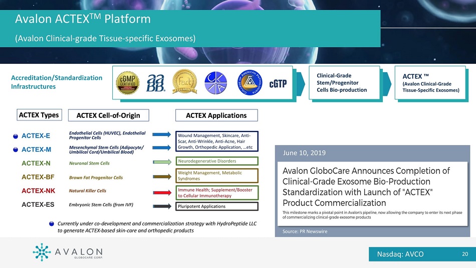 Avalon ACTEX TM Platform (Avalon Clinical - grade Tissue - specific Exosomes) Clinical - Grade Stem/Progenitor Cells Bio - production ACTEX Ρ (Avalon Clinical - Grade Tissue - Specific Exosomes) Accreditation/Standardization Infrastructures Nasdaq: AVCO 20
