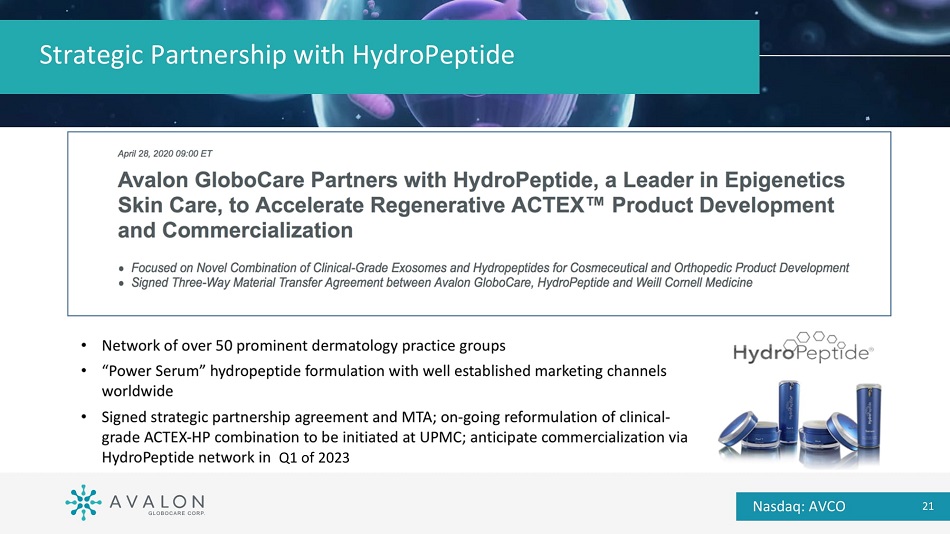Strategic Partnership with HydroPeptide Q1 of 2023 Nasdaq: AVCO 21