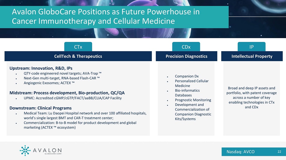 Broad and deep IP assets and portfolio, with patent coverage across a number of key enabling technologies in CTx and CDx Avalon GloboCare Positions as Future Powerhouse in Cancer Immunotherapy and Cellular Medicine IP Intellectual Property ● Companion Dx ● Personalized Cellular Medicine ● Bio - informatics Databases ● Prognostic Monitoring ● Development and Commercialization of Companion Diagnostic Kits/Systems CDx Precision Diagnostics Upstream: Innovation, R&D, IPs ● QTY - code engineered novel targets; AVA - Trap Ρ ● Next - Gen multi - target, RNA - based Flash - CAR Ρ ● Angiogenic Exosomes; ACTEX Ρ Midstream: Process development, Bio - production, QC/QA ● UPMC: Accredited cGMP/cGTP/FACT/aaBB/CLIA/CAP Facility Downstream: Clinical Programs ● Medical Team: Lu Daopei Hospital network and over 100 affiliated hospitals, world’s single largest BMT and CAR - T treatment center; ● Commercialization: B - to - B model for product development and global marketing (ACTEX Ρ ecosystem) CTx Nasdaq: AVCO 22 CellTech & Therapeutics