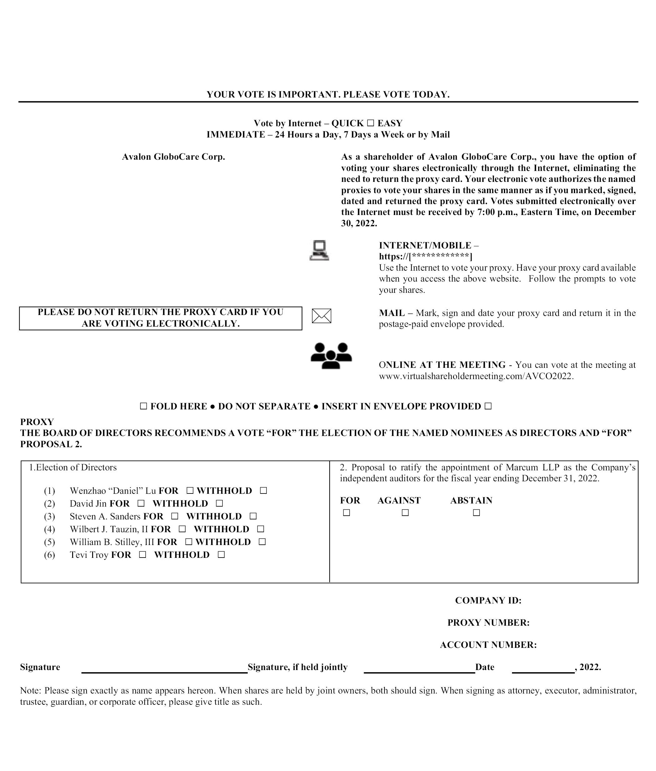 YOUR VOTE IS IMPORTANT. PLEASE VOTE TODAY. Vote by Internet – QUICK EASY IMMEDIATE – 24 Hours a Day, 7 Days a Week or by Mail Avalon GloboCare Corp. As a shareholder of Avalon GloboCare Corp., you have the option of voting your shares electronically through the Internet, eliminating the need to return the proxy card. Your electronic vote authorizes the named proxies to vote your shares in the same manner as if you marked, signed, dated and returned the proxy card. Votes submitted electronically over the Internet must be received by 7:00 p.m., Eastern Time, on December 30, 2022. INTERNET/MOBILE – https://[] Use the Internet to vote your proxy. Have your proxy card available when you access the above website. Follow the prompts to vote your shares. PLEASE DO NOT RETURN THE PROXY CARD IF YOU ARE VOTING ELECTRONICALLY. MAIL – Mark, sign and date your proxy card and return it in the postage-paid envelope provided. ONLINE AT THE MEETING - You can vote at the meeting at www.virtualshareholdermeeting.com/AVCO2022. FOLD HERE DO NOT SEPARATE INSERT IN ENVELOPE PROVIDED PROXY THE BOARD OF DIRECTORS RECOMMENDS A VOTE “FOR” THE ELECTION OF THE NAMED NOMINEES AS DIRECTORS AND “FOR” PROPOSAL 2. 1.Election of Directors (1) Wenzhao “Daniel” Lu FOR WITHHOLD (2) David Jin FOR WITHHOLD (3) Steven A. Sanders FOR WITHHOLD (4) Wilbert J. Tauzin, II FOR WITHHOLD (5) William B. Stilley, III FOR WITHHOLD (6) Tevi Troy FOR WITHHOLD 2. Proposal to ratify the appointment of Marcum LLP as the Company’s independent auditors for the fiscal year ending December 31, 2022. FOR AGAINST ABSTAIN COMPANY ID: PROXY NUMBER: ACCOUNT NUMBER: Signature Signature, if held jointly Date , 2022. Note: Please sign exactly as name appears hereon. When shares are held by joint owners, both should sign. When signing as attorney, executor, administrator, trustee, guardian, or corporate officer, please give title as such.