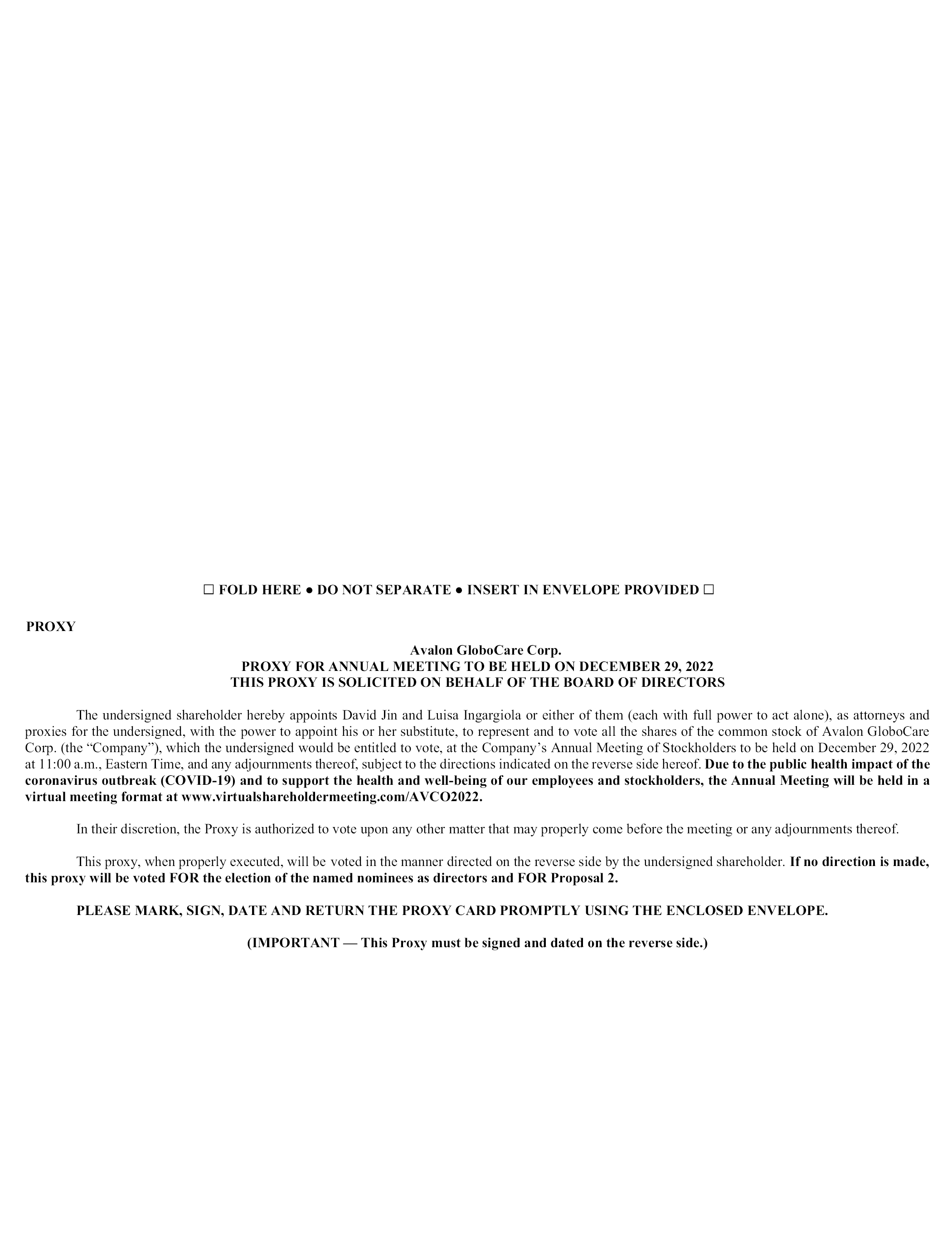 FOLD HERE DO NOT SEPARATE INSERT IN ENVELOPE PROVIDED PROXY Avalon GloboCare Corp. PROXY FOR ANNUAL MEETING TO BE HELD ON DECEMBER 29, 2022 THIS PROXY IS SOLICITED ON BEHALF OF THE BOARD OF DIRECTORS The undersigned shareholder hereby appoints David Jin and Luisa Ingargiola or either of them (each with full power to act alone), as attorneys and proxies for the undersigned, with the power to appoint his or her substitute, to represent and to vote all the shares of the common stock of Avalon GloboCare Corp. (the “Company”), which the undersigned would be entitled to vote, at the Company’s Annual Meeting of Stockholders to be held on December 29, 2022 at 11:00 a.m., Eastern Time, and any adjournments thereof, subject to the directions indicated on the reverse side hereof. Due to the public health impact of the coronavirus outbreak (COVID-19) and to support the health and well-being of our employees and stockholders, the Annual Meeting will be held in a virtual meeting format at www.virtualshareholdermeeting.com/AVCO2022. In their discretion, the Proxy is authorized to vote upon any other matter that may properly come before the meeting or any adjournments thereof. This proxy, when properly executed, will be voted in the manner directed on the reverse side by the undersigned shareholder. If no direction is made, this proxy will be voted FOR the election of the named nominees as directors and FOR Proposal 2. PLEASE MARK, SIGN, DATE AND RETURN THE PROXY CARD PROMPTLY USING THE ENCLOSED ENVELOPE. (IMPORTANT — This Proxy must be signed and dated on the reverse side.)