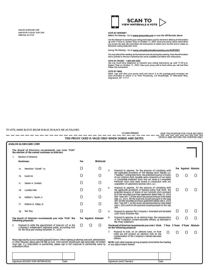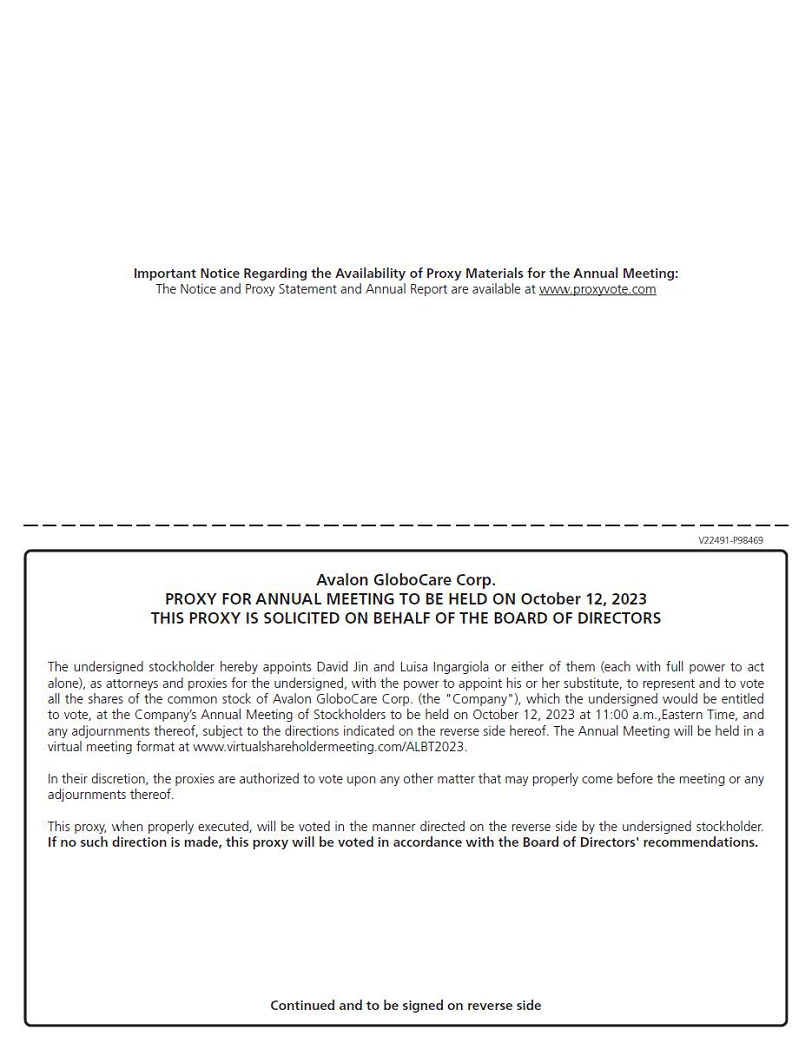 NOTICE IS HEREBY GIVEN that the 2023 Annual Meeting of Stockholders (the “Annual Meeting”) of Avalon GloboCare Corp. (the “Company”) will be held on Thursday, October 12, 2023, beginning at 11:00 a.m. Eastern Time. The Annual Meeting will be held virtually via the Internet at a virtual audio web conference at www.virtualshareholdermeeting.com/ALBT2023. You will not be able to attend the Annual Meeting at a physical location. At the Annual Meeting, stockholders will consider and vote on the following matters: